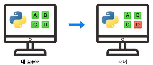 만약 이과정에서 우리는 다 구성했다고 했지만 서버의 환경에서는 D가 문제가 된다거나 실수로 설치하지 못했다거나 등 내 컴퓨터와 서버의 환경에 맞지 않아 우리가 개발한 파이썬 프로그램이 실행되지 않는 문제가 발생할 수 있습니다.